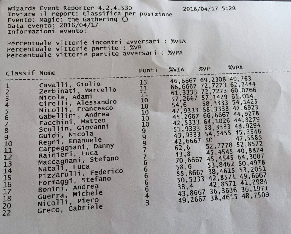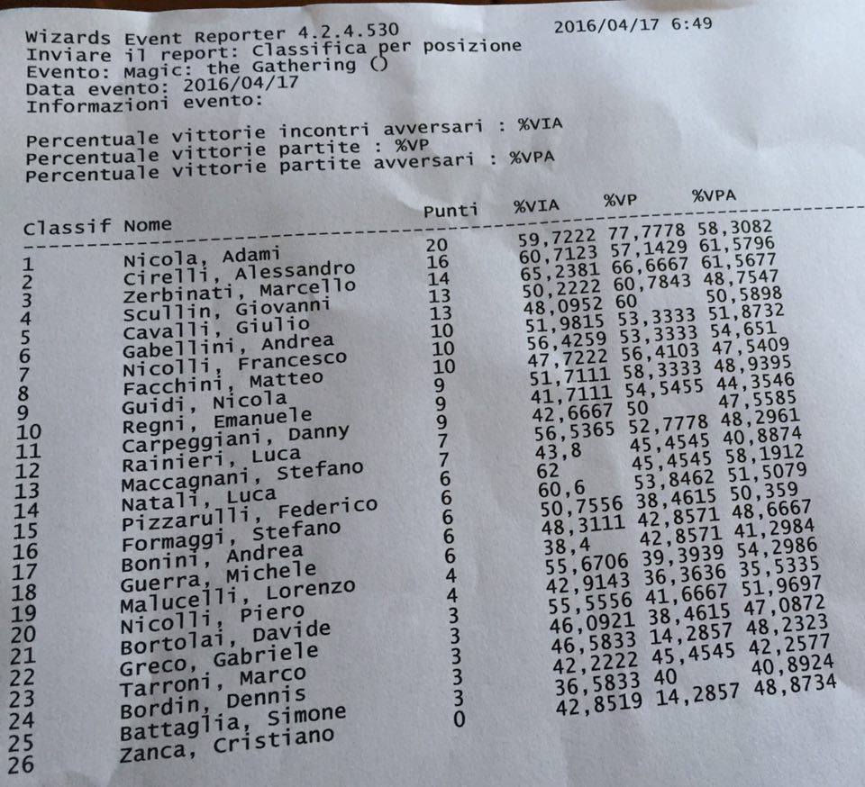 La top8 decide poi di giocare e vincono il Tom Ross ferrarese con poderose sculate sull'inerme Gabellini, Gimmi con il suo D&T, lo Scullin che ha la meglio sul Painter di Horsy dopo due game tiratissimi e infine lo Zerbo che vince in rapidità contro il povero Facchini che prende il MU peggiore in top rigiocando contro Eldrazi del favorito pure in top oltre che in svizzera.