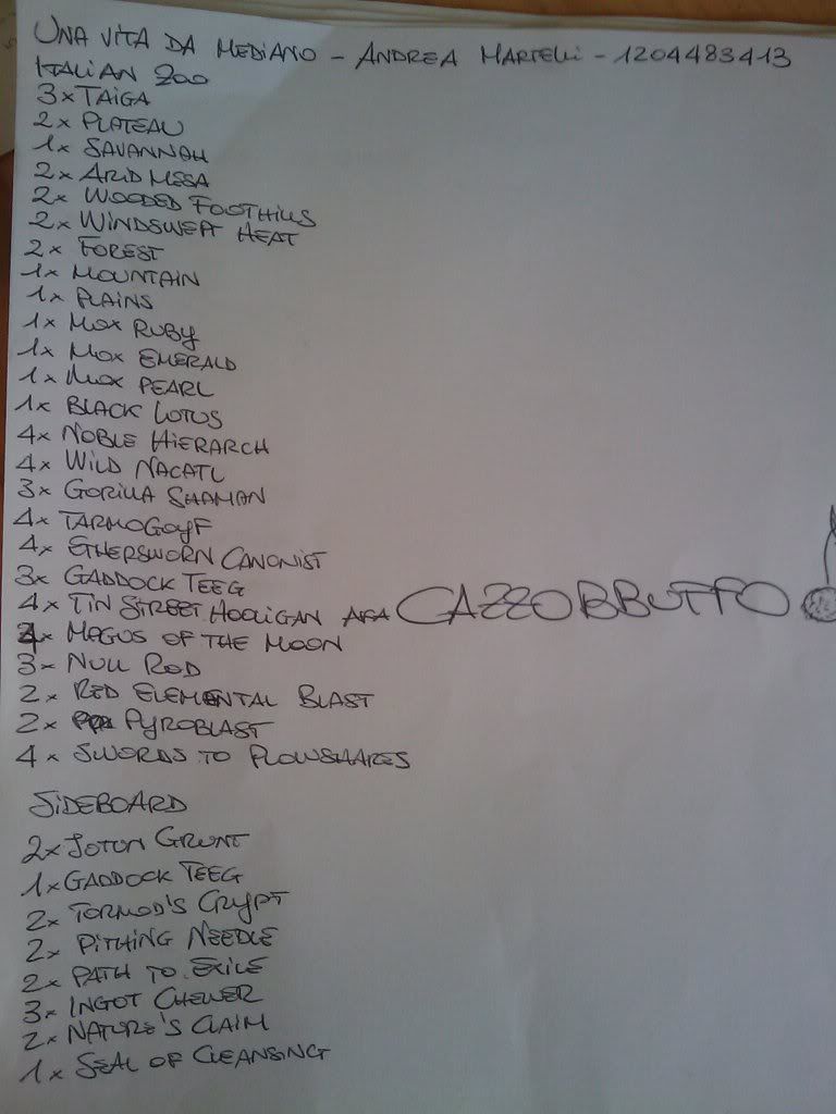 Top8 (luca zannella?) Fastbond tinker gush etc..la prima subito nn riesco a capire cosa gioca perchè parte di library, io per non sbagliare slando e metto null rod, non riesce a partire ma non vede ne magus ne cose insolite per zoo, la seconda gaddock e canonista gli complicano la vita mentre picchiano, ma lui riesci a fare 2 volte hurkyl e a chiudere indisturbato, veramente bravo, la terza prova la via di tinker, ma ho spiga in mano e 2 magus pescati dopo gli impediscono di fare altro..